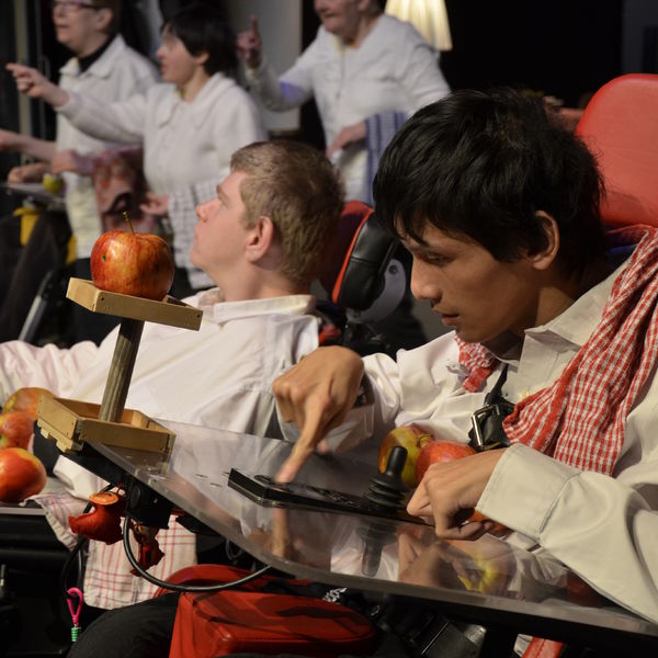 Het stuk ligt niet op voorhand vast. Het ontstaat gaandeweg. De docenten spelen in op wat er gebeurt, wat er leeft op het moment, wat iemand aanbrengt. Zo groeit een toneelstuk. Ze houden natuurlijk wel rekening met de grenzen en mogelijkheden van de spelers. En ook al weten sommige zwakker functionerende bewoners niet altijd wat er gebeurt, toch zitten ze helemaal mee in de flow van het spel. Het is dan mooi om te zien dat zij de grenzen van hun kunnen verleggen.