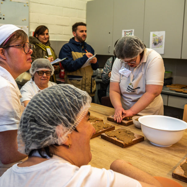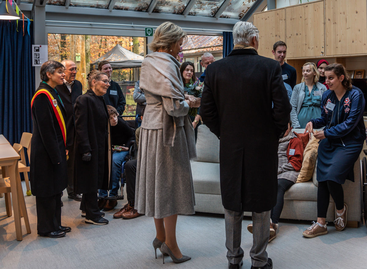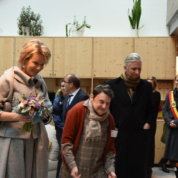 Bij de bakkerij, vervolgens, boden enkele bewoners die daar aan de slag waren, graag een proevertje van hun bakkunsten aan. Onze directeurs Johan Vermeeren en Kris De Koninck lichtten het belang van een gevarieerde en zinvolle dagbesteding toe. ‘Oh, als jij een tweede stukje speculaas mag nemen, dan ik ook!’, lachtte de Koningin, toen ze haar man een extra stukje zag snoepen.