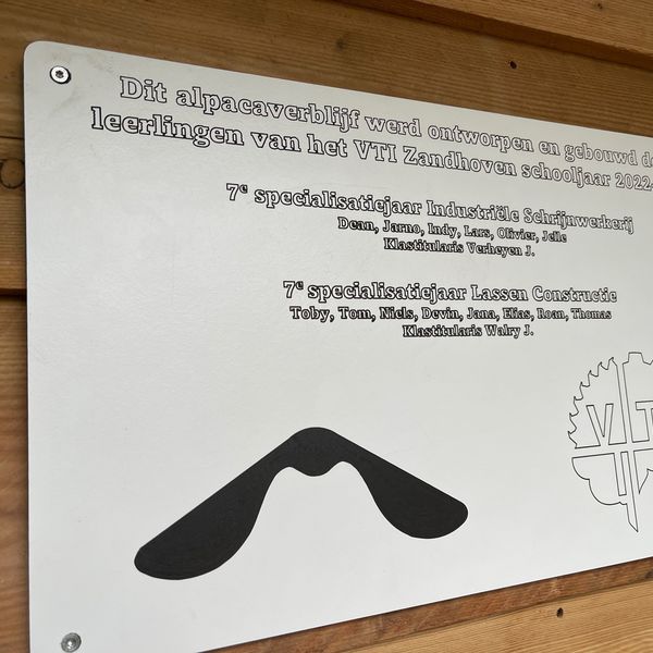 Weldra kunnen ze zich ook neervlijen in een prachtige woonst – momenteel hebben ze een tijdelijke beschutting. De zes leerlingen van het zevende specialisatiejaar Industriële schrijnwerkerij van het VTI Zandhoven zijn volop bezig aan het alpacaverblijf, onder leiding van hun klastitularis Johan Verheyen. Opnieuw een aangename samenwerking met het VTI, dat eerder ook al zorgde voor onze knappe Vlinderboom.