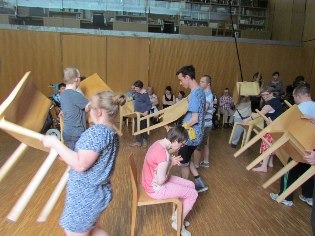 We beginnen voorzichtig: we zitten op een stoel, wiegen heel zachtjes heen en weer, ontspannen en bewegen mee met de muziek. We bewegen elk op zich, of worden tegenover elkaar gezet. We spelen met elkaar of naast elkaar en proberen ook samen als groep te bewegen.